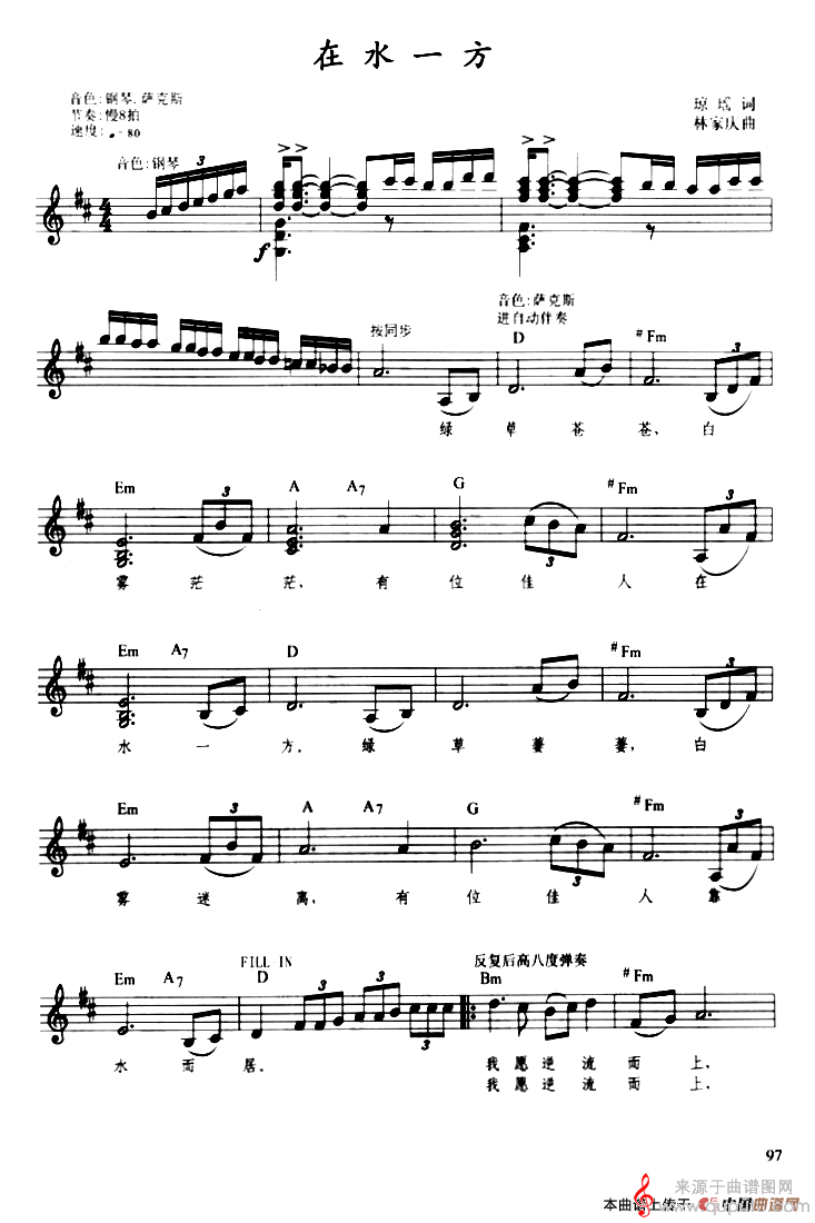 曲谱图网为您提供在水一方(带歌词提示版)找谱子,就上曲谱图网。