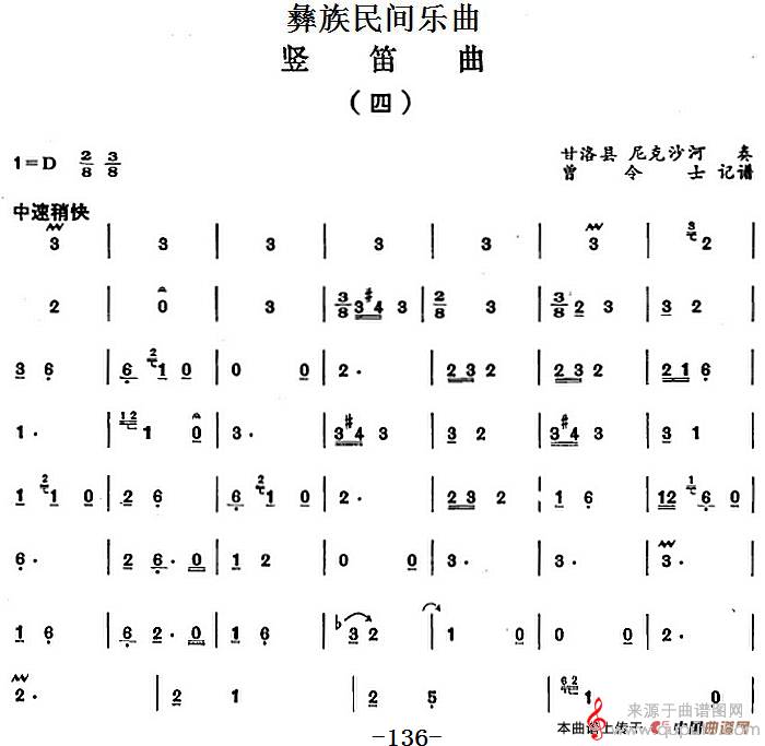 曲谱图网为您提供彝族民间乐曲:竖笛曲(四)笛子独奏)找谱子,就上曲谱图网。