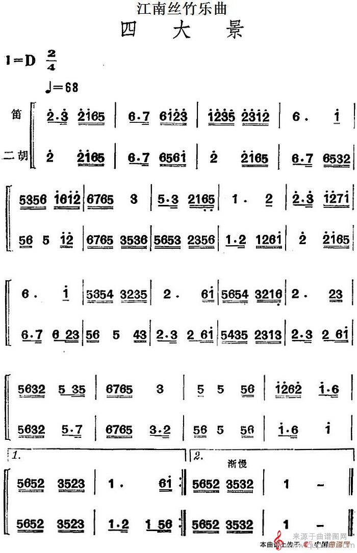 曲谱图网为您提供江南丝竹乐曲:四大景(笛箫)找谱子,就上曲谱图网。