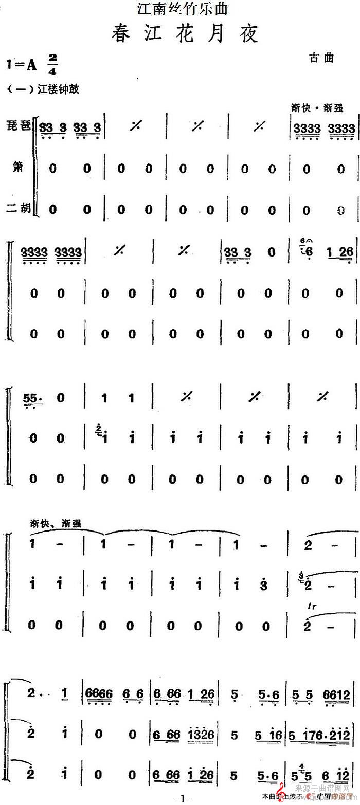 曲谱图网为您提供江南丝竹乐曲:春江花月夜(二胡+箫+二胡)找谱子,就上曲谱图网。