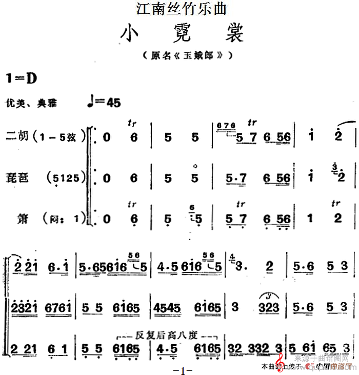 曲谱图网为您提供江南丝竹乐曲:小霓裳(二胡+琵琶+箫)找谱子,就上曲谱图网。