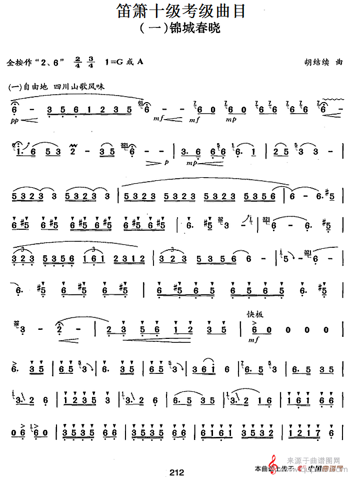 曲谱图网为您提供笛箫十级考级曲目:锦城春晓(笛子独奏)找谱子,就上曲谱图网。