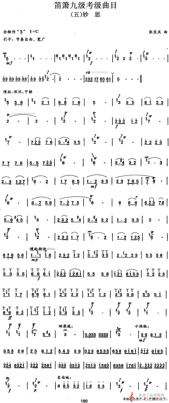 曲谱图网为您提供笛箫九级考级曲目:妙思(笛子曲谱)找谱子,就上曲谱图网。
