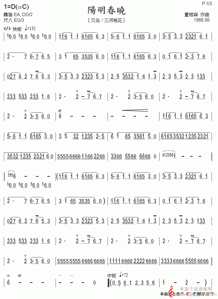 曲谱图网为您提供阳明春晓(又名:三月桃花)简谱(阳明春晓笛子独奏简谱)找谱子,就上曲谱图网。