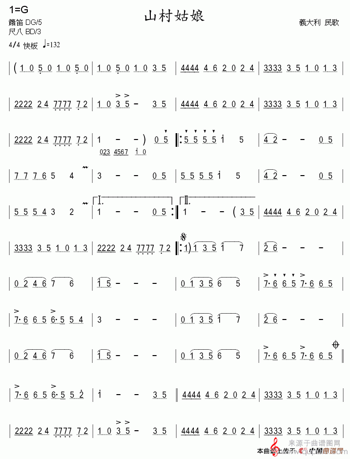 山村姑娘简谱(意大利民歌、箫)(山村姑娘洞箫乐曲谱)