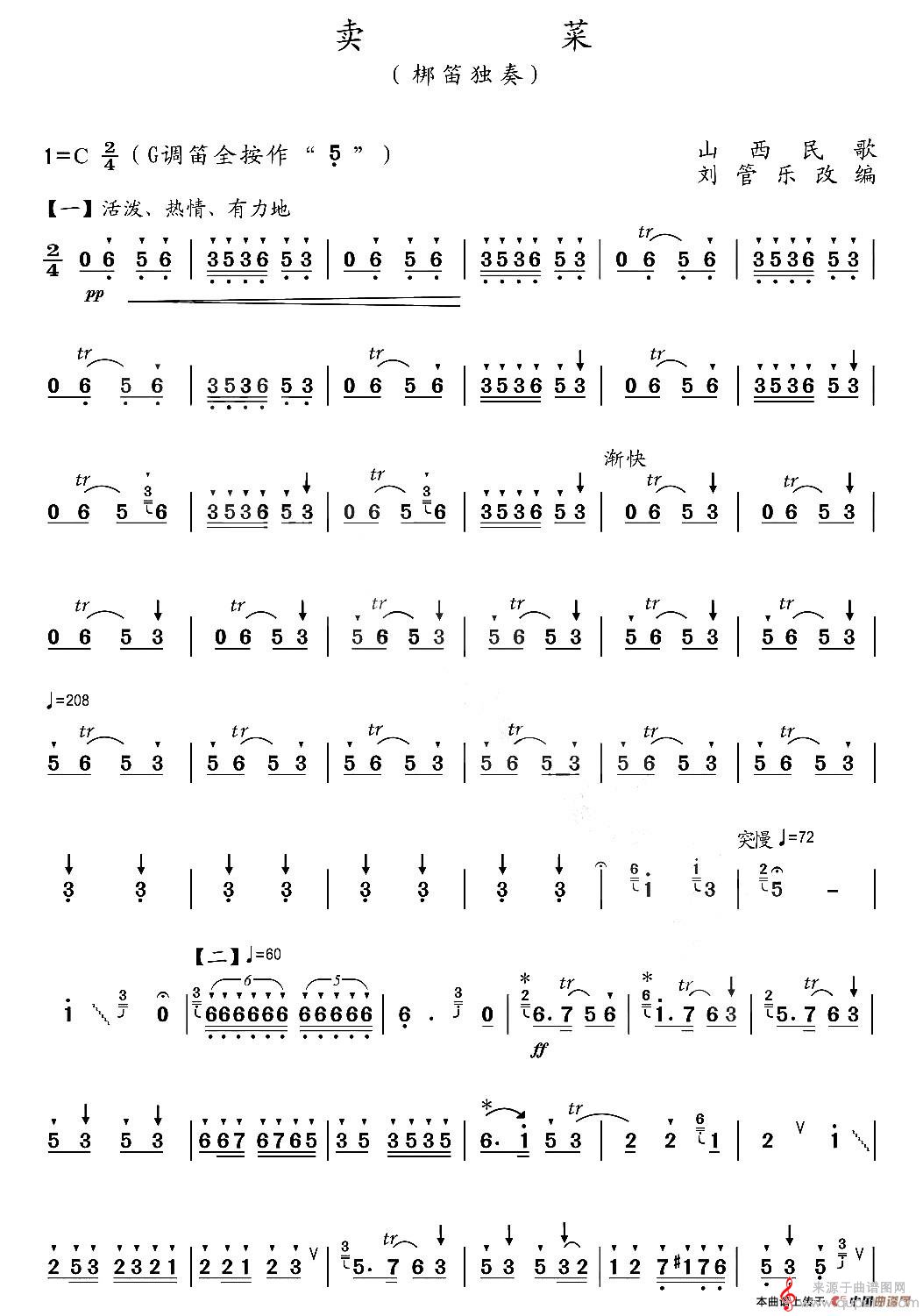 曲谱图网为您提供卖菜山西民歌简谱(卖菜梆笛独奏曲谱)找谱子,就上曲谱图网。