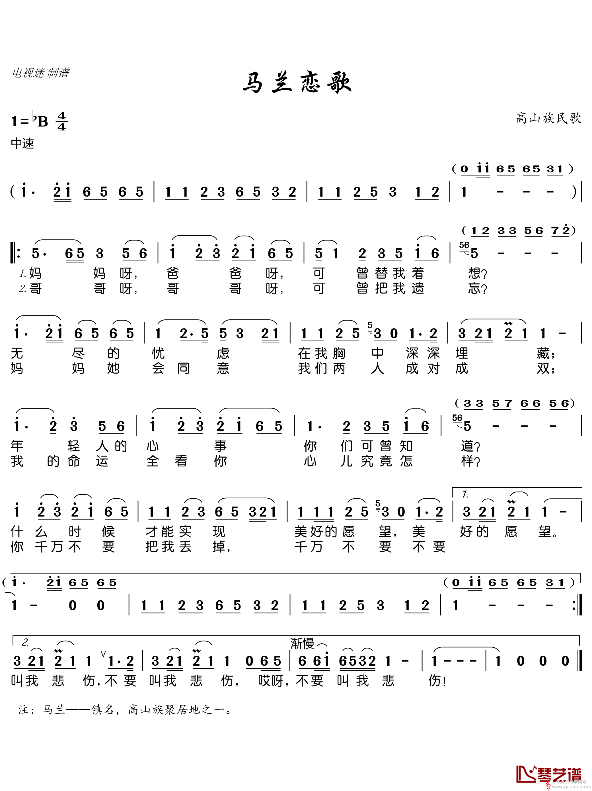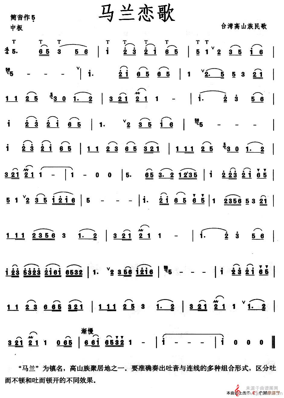 曲谱图网为您提供马兰恋歌曲谱(马兰恋歌笛子独奏简谱)找谱子,就上曲谱图网。