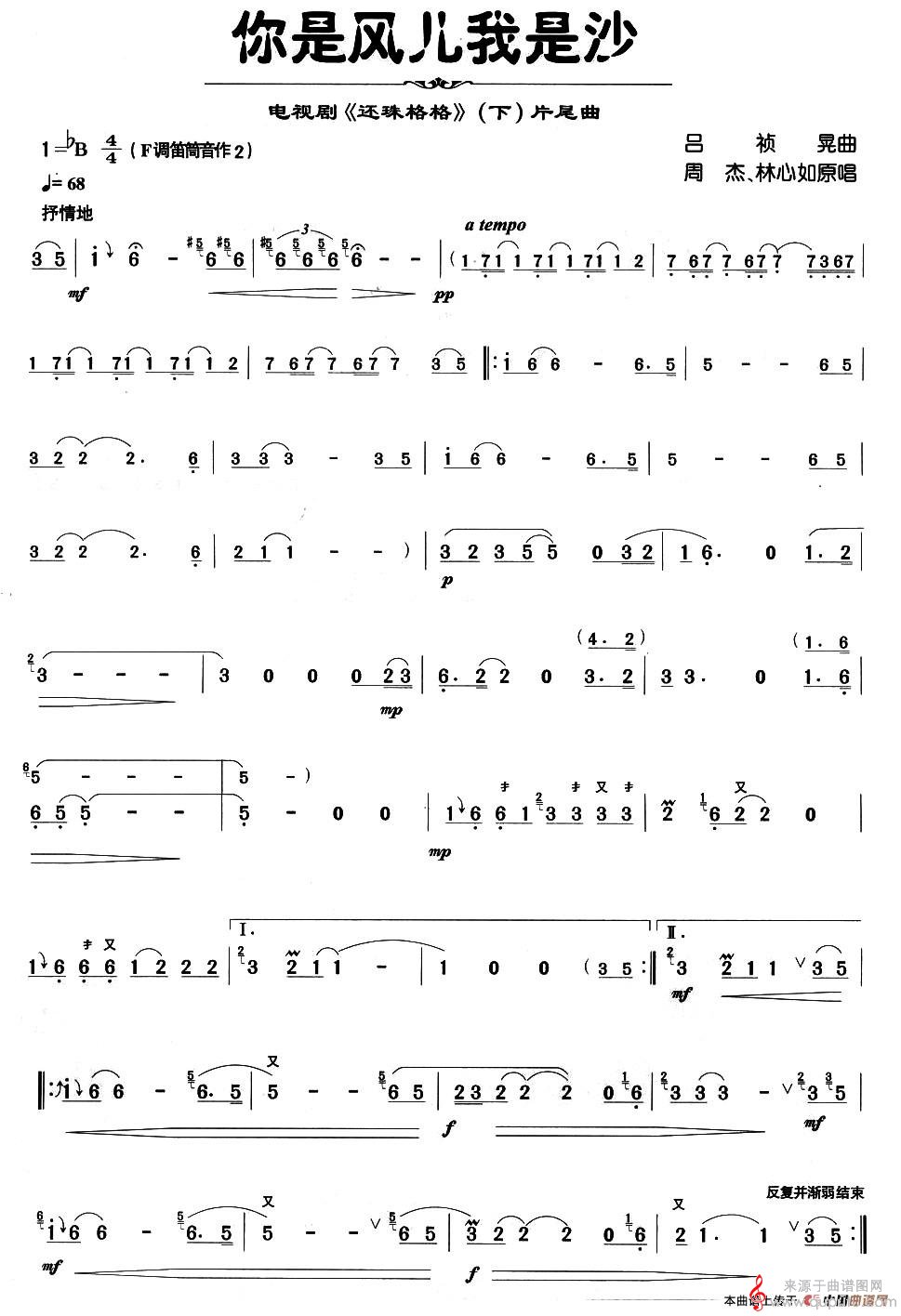 曲谱图网为您提供你是风儿我是沙简谱(你是风儿我是沙笛子独奏简谱)找谱子,就上曲谱图网。