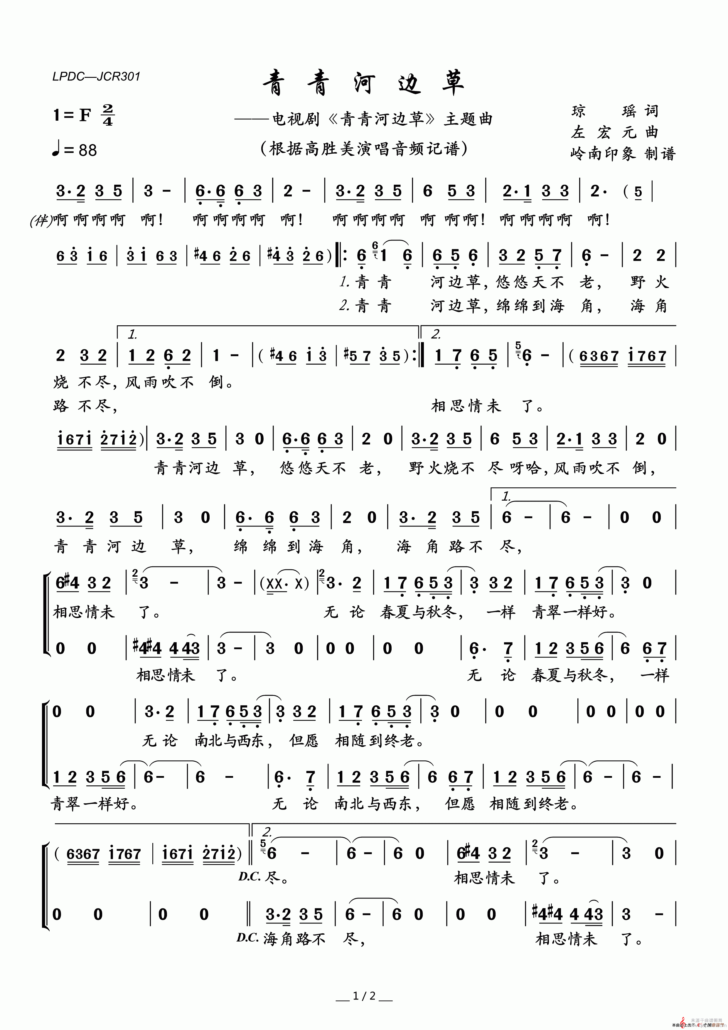 曲谱图网为您提供青青河边草简谱(青青河边草笛子演奏曲谱)找谱子,就上曲谱图网。