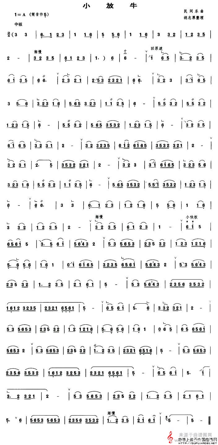 曲谱图网为您提供小放牛(胡志厚整理版)民乐曲谱(小放牛笛子独奏简谱)找谱子,就上曲谱图网。