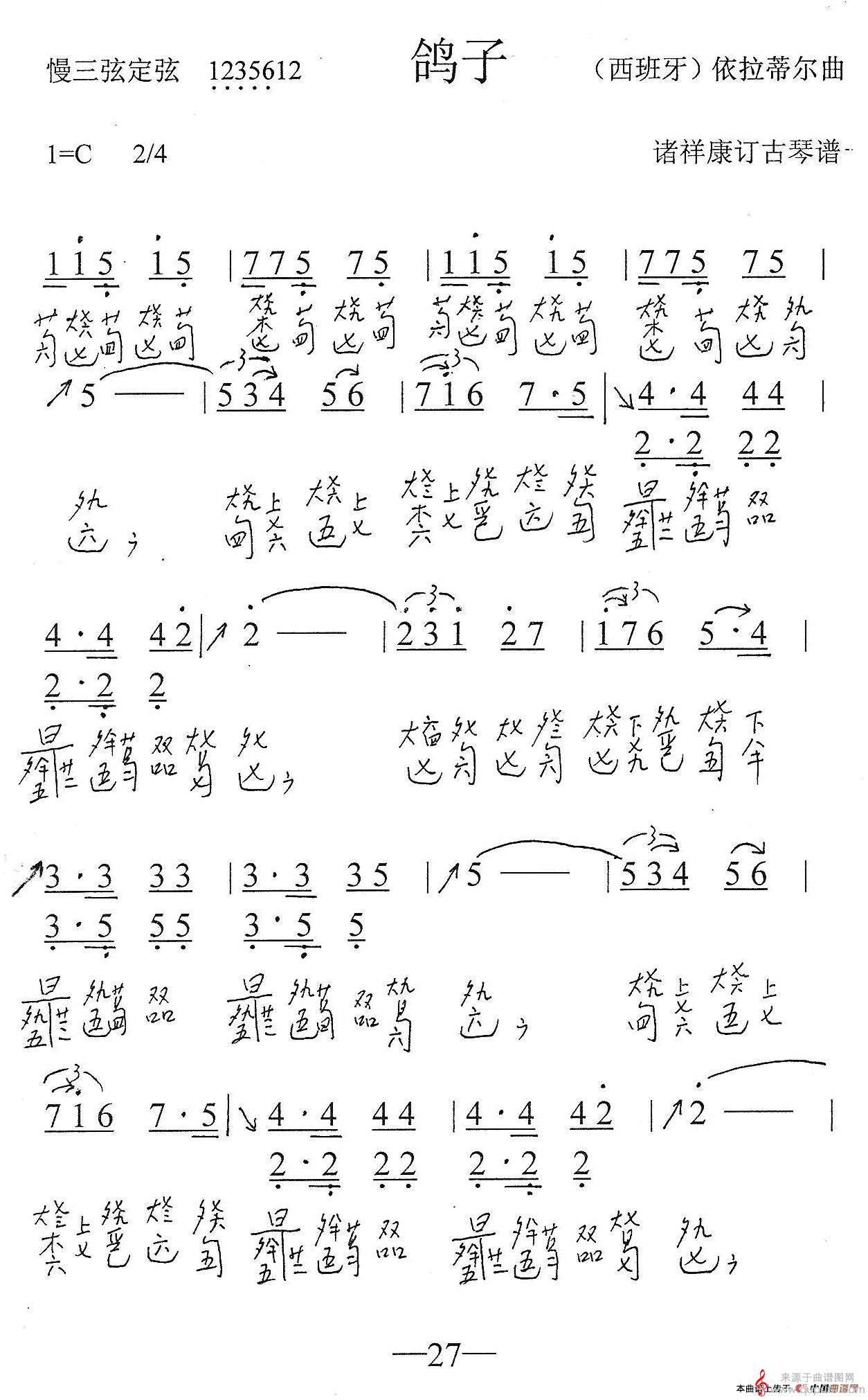 曲谱图网为您提供鸽子(鸽子古琴曲、简谱+减字谱歌词简谱)找谱子,就上曲谱图网。
