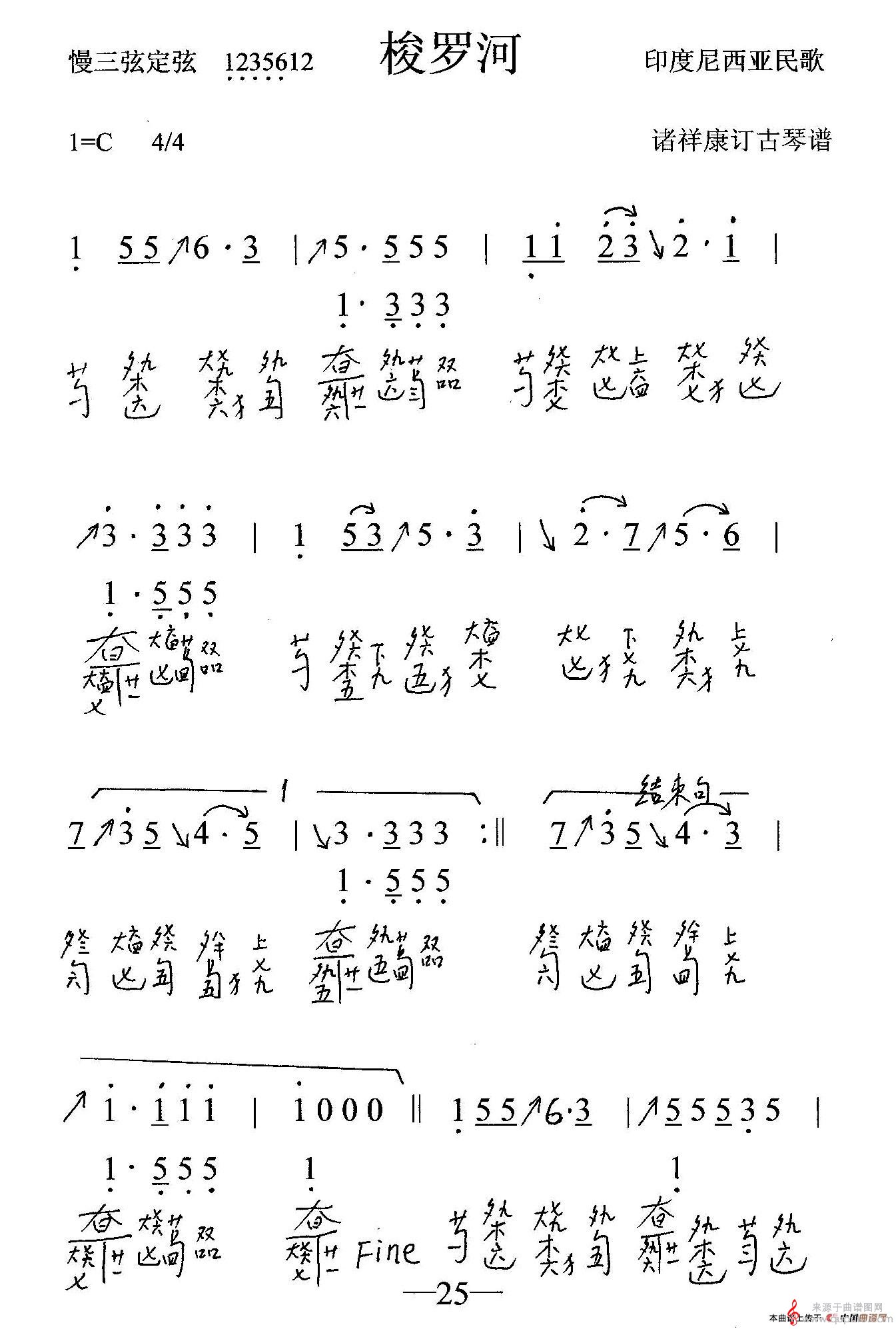 梭罗河(印度尼西亚民歌梭罗河( 古琴谱、简谱+减字谱简谱)