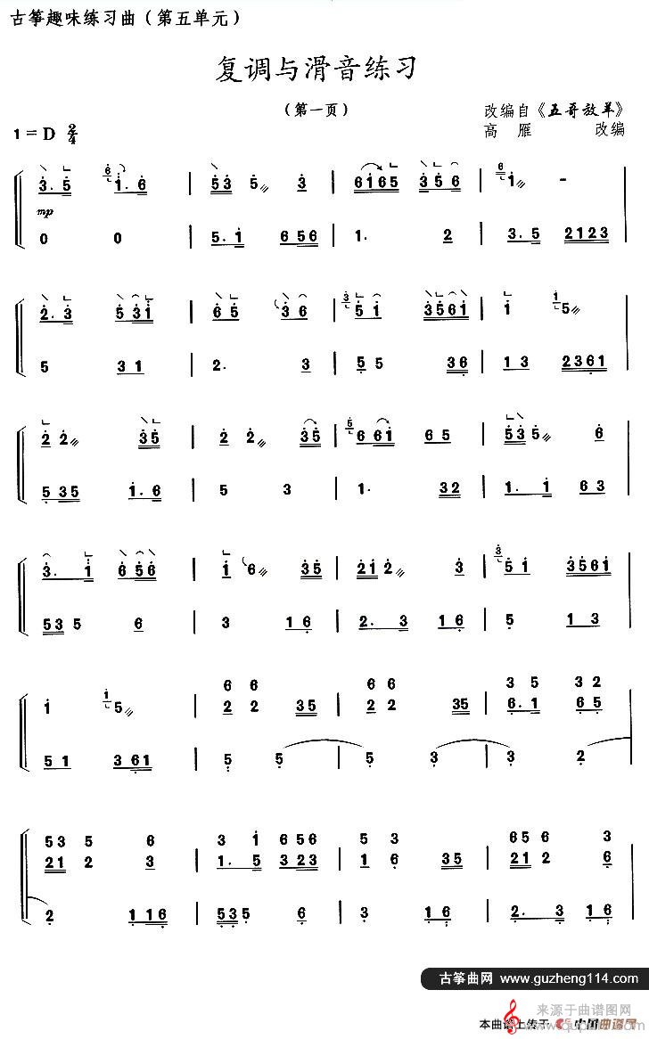 曲谱图网为您提供古筝练习:复调与滑音练习(改编自《五哥放羊》简谱古筝谱)找谱子,就上曲谱图网。