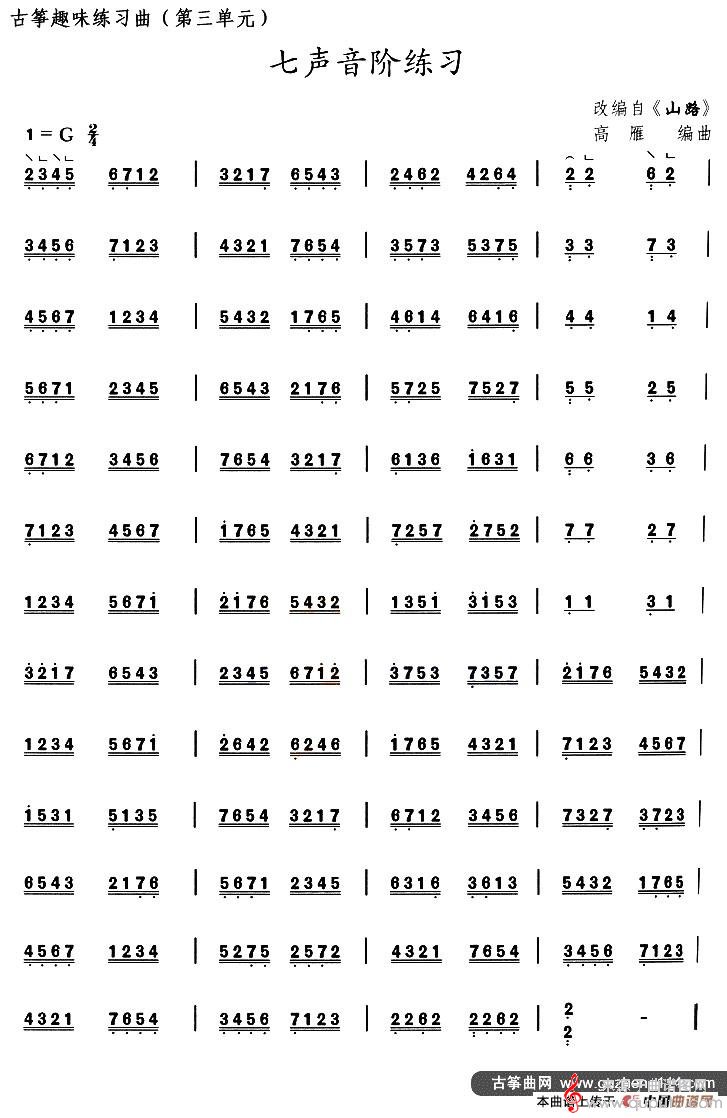 曲谱图网为您提供古筝七声音阶练习(选调《山路》)曲谱古筝谱找谱子,就上曲谱图网。