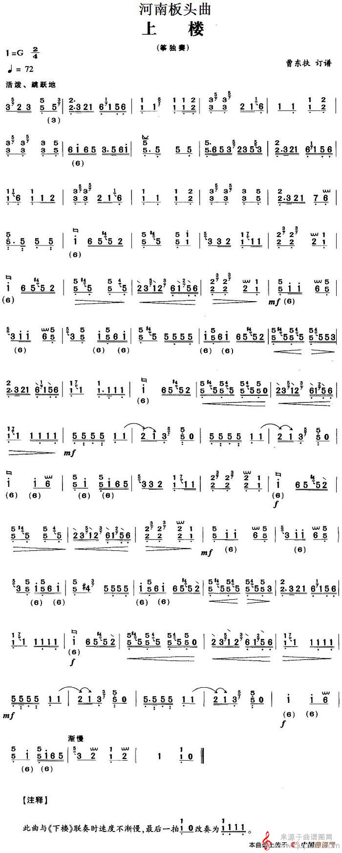 曲谱图网为您提供河南板头曲:上楼(筝独奏曲曹东扶订谱版上楼简谱曲谱)找谱子,就上曲谱图网。