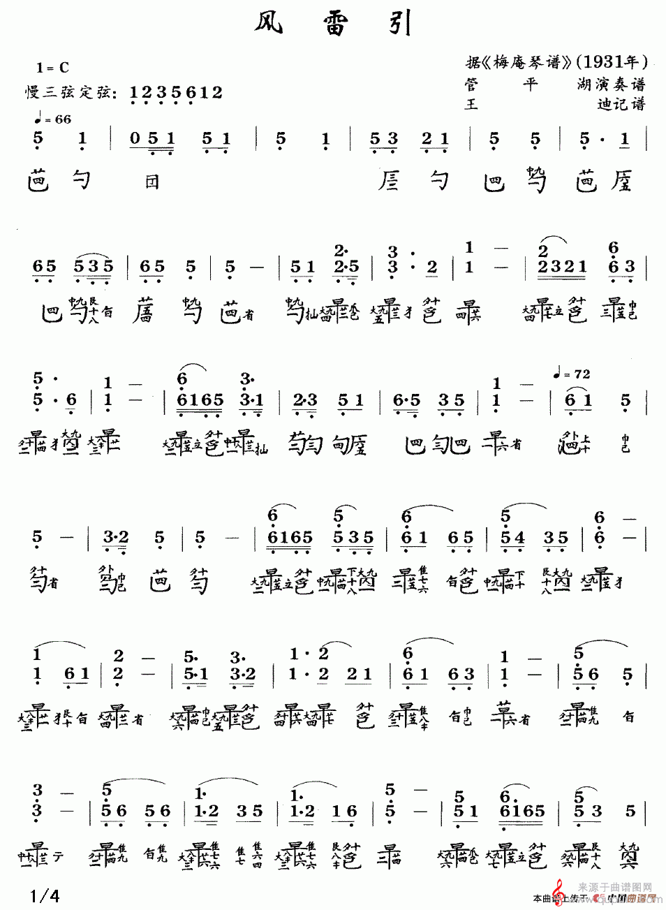 曲谱图网为您提供风雷引(管平湖演奏版、古琴谱、简谱+减字谱简谱教学)找谱子,就上曲谱图网。