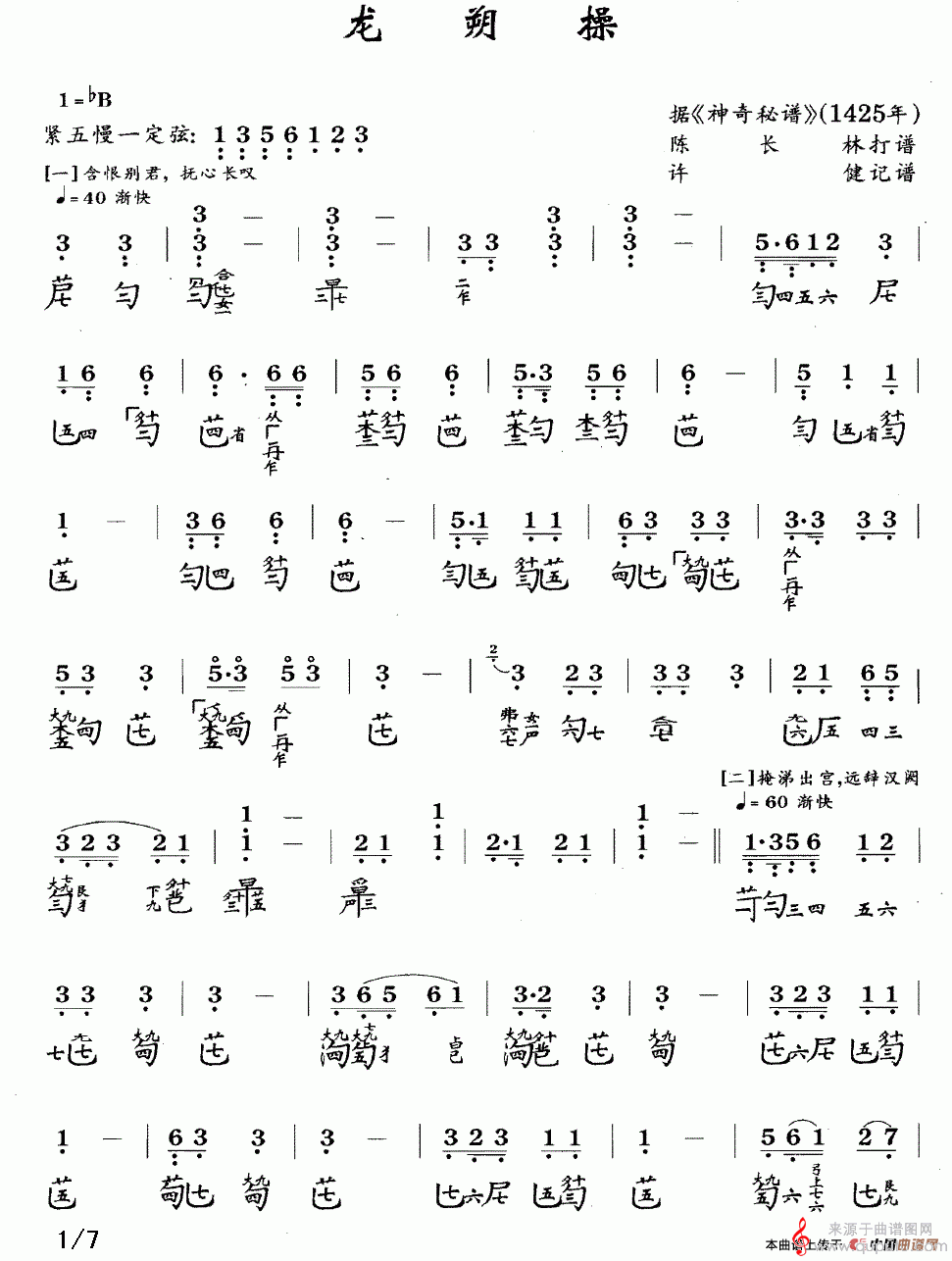 龙朔操(古琴谱、简谱+减字谱龙朔操歌词歌曲简谱)