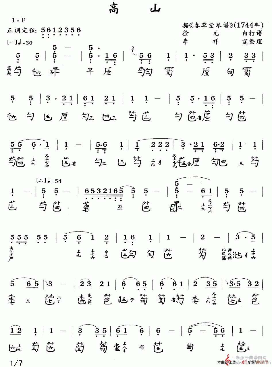 曲谱图网为您提供高山(古琴谱 简谱+减字谱 高山原创简谱曲谱)找谱子,就上曲谱图网。