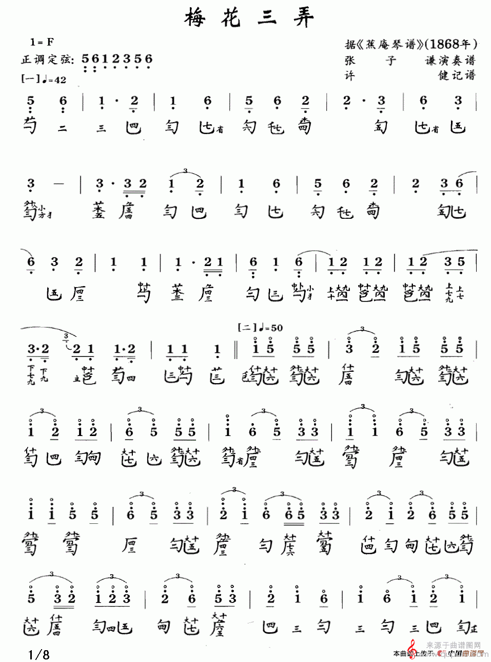 梅花三弄(古琴谱 F调 简谱+减字谱 张子谦演奏谱梅花三弄古琴谱曲谱)