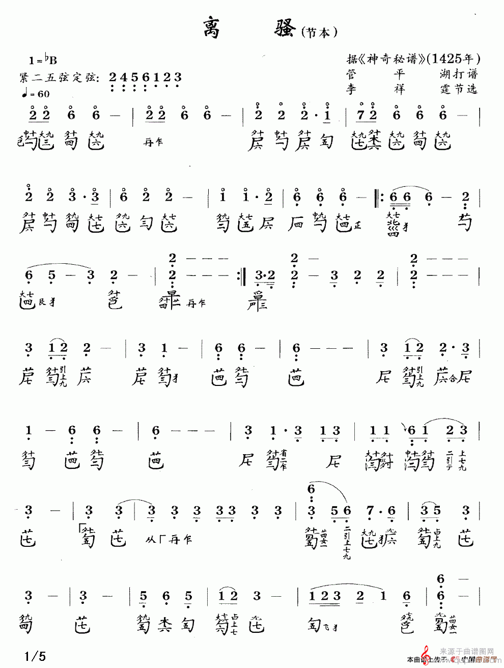 曲谱图网为您提供离骚(节本)(古琴谱 降B调 简谱+减字谱离骚歌词歌曲简谱)找谱子,就上曲谱图网。