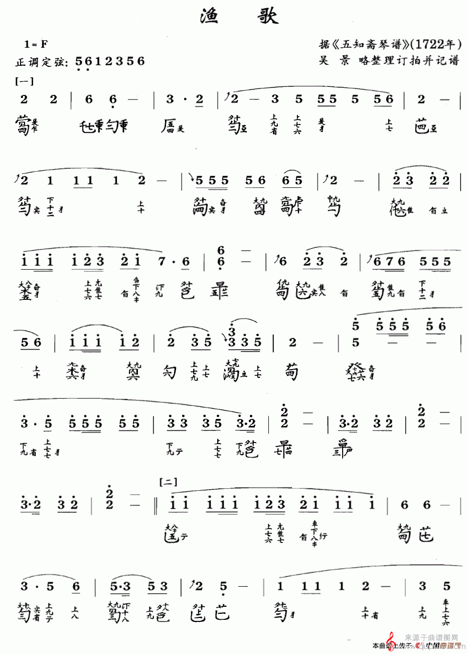 曲谱图网为您提供渔歌(吴景略演奏版、古琴谱 F调 简谱+减字谱渔歌原创简谱曲谱)找谱子,就上曲谱图网。