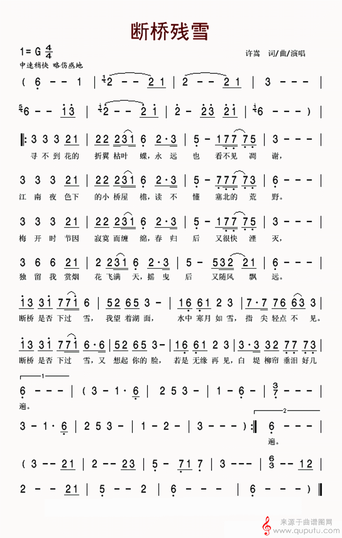 曲谱图网为您提供断桥残雪(葫芦丝曲独奏简谱)找谱子,就上曲谱图网。
