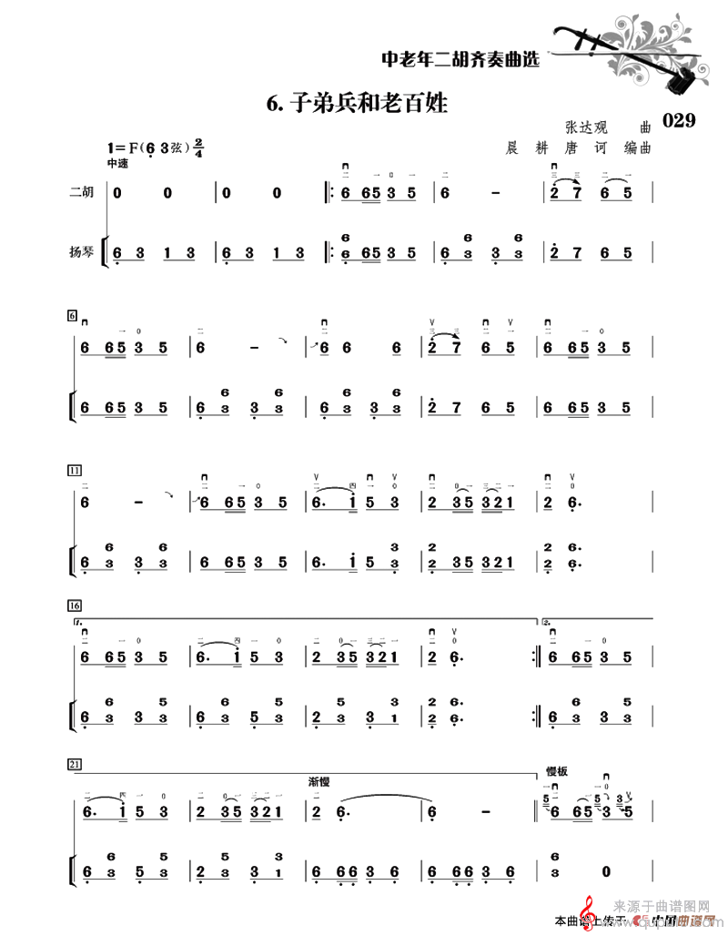 曲谱图网为您提供子弟兵和老百姓(二胡+扬琴伴奏)找谱子,就上曲谱图网。