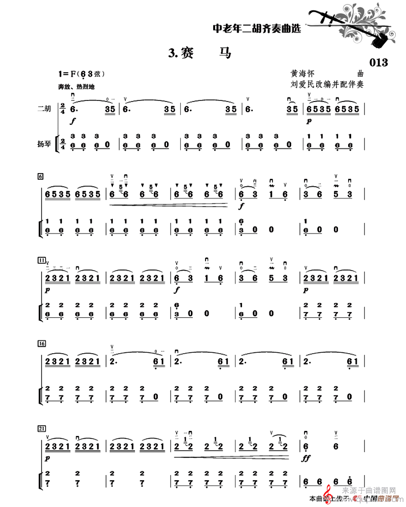 曲谱图网为您提供赛马(二胡+扬琴伴奏、刘爱民改编配伴奏版)找谱子,就上曲谱图网。