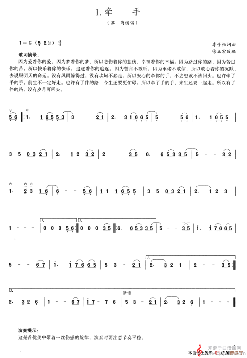 曲谱图网为您提供牵手(李子恒词曲、徐正宏改编)找谱子,就上曲谱图网。