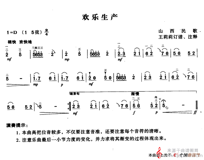 曲谱图网为您提供欢乐生产(山西民歌、王莉莉订谱)找谱子,就上曲谱图网。