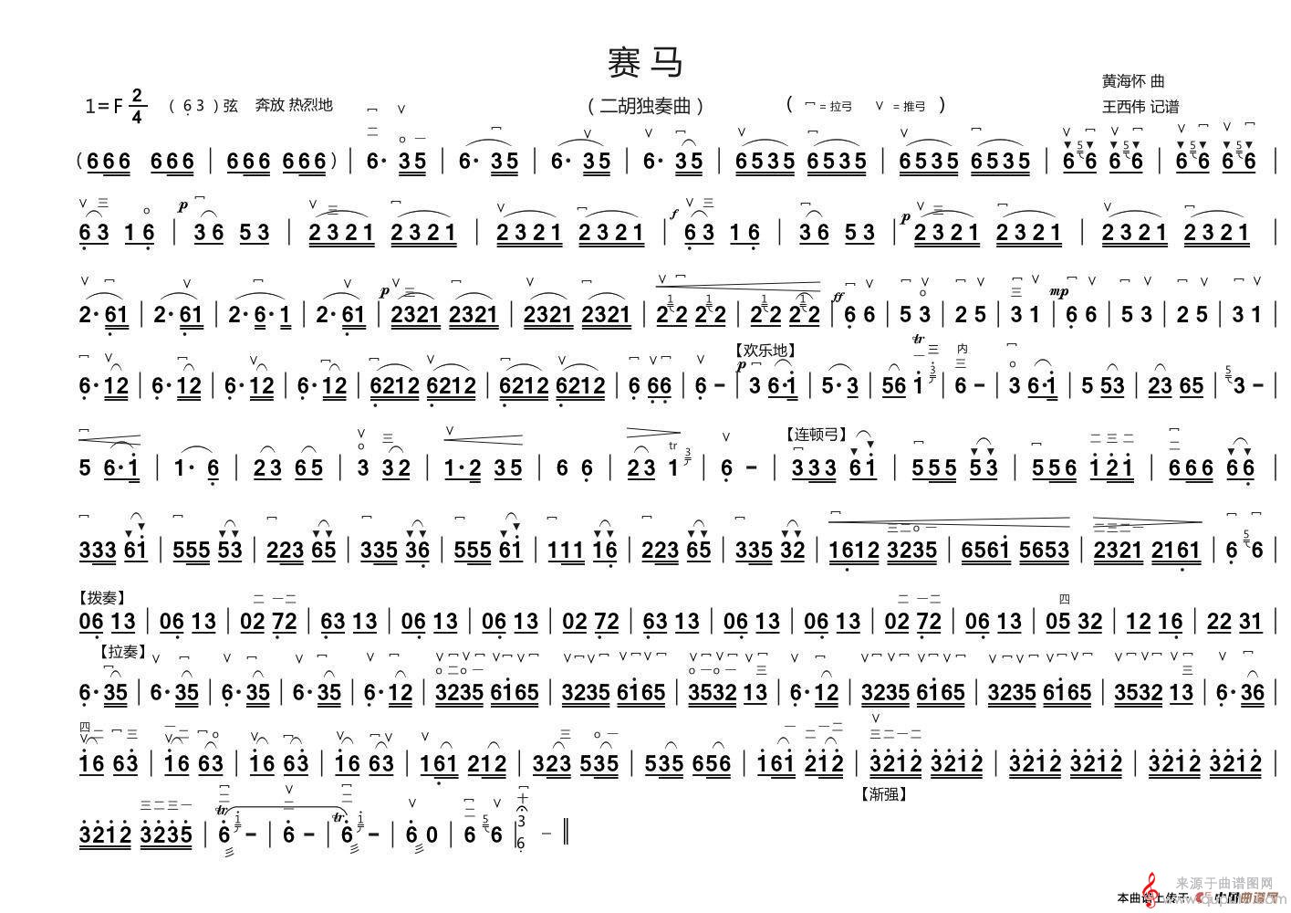 曲谱图网为您提供赛马(赛马二胡独奏曲、王西伟制谱版)找谱子,就上曲谱图网。
