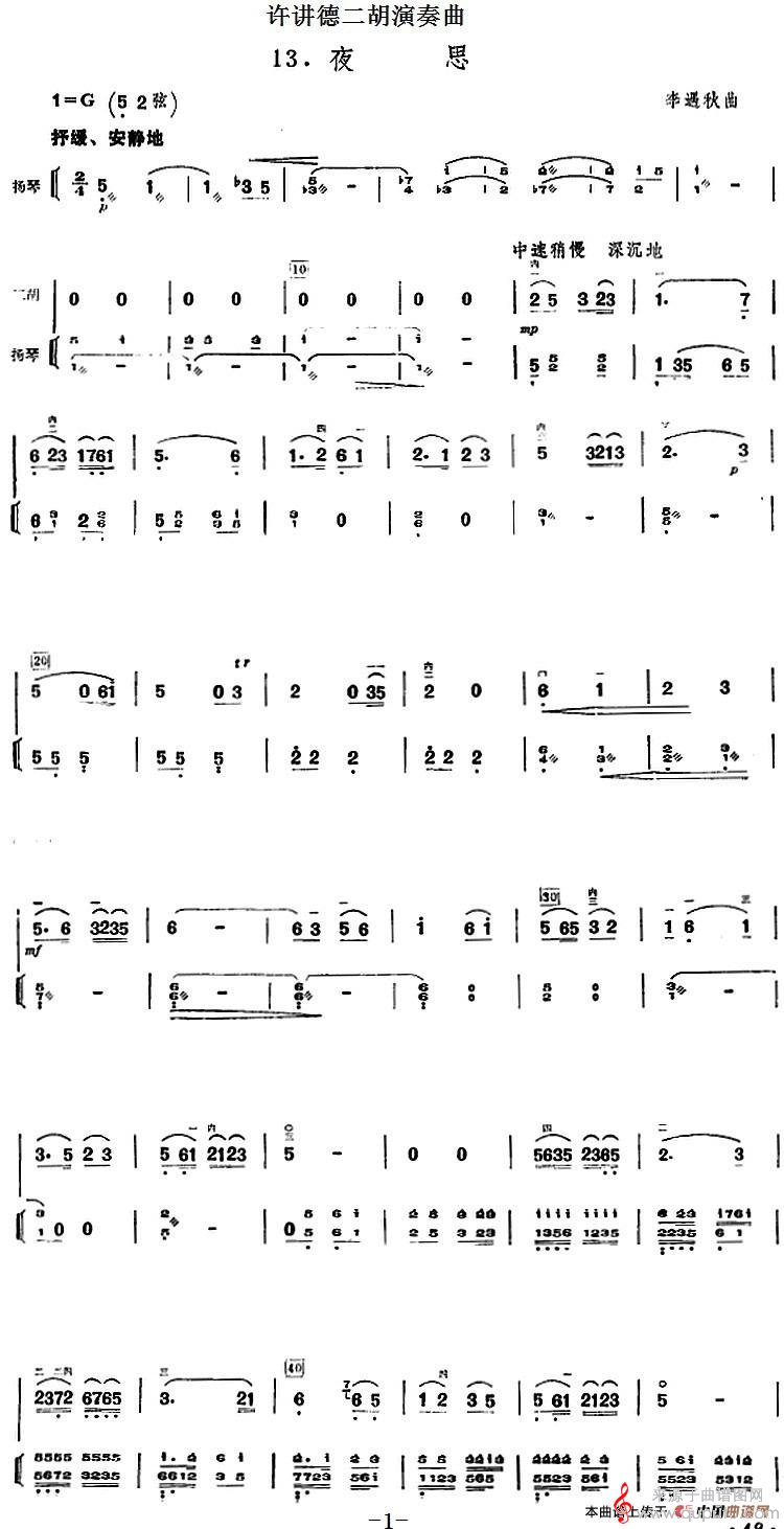 曲谱图网为您提供许讲德二胡演奏曲:13.夜思简谱(许讲德二胡演奏曲:13.夜思胡琴演奏简谱)找谱子,就上曲谱图网。