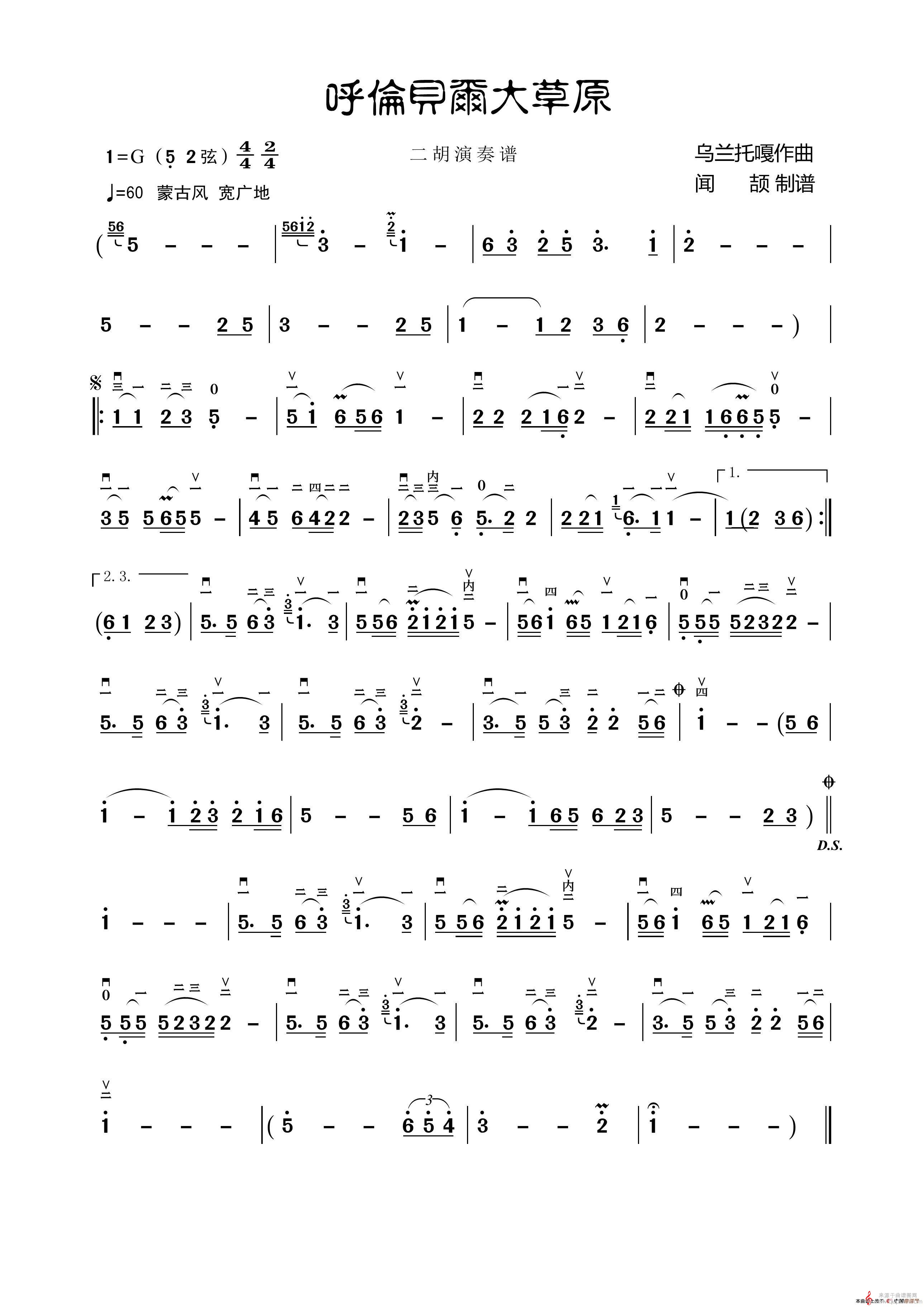 当前位置:曲谱图网器乐曲谱胡琴呼伦贝尔大草原歌曲简谱(呼伦贝尔大草原二胡演奏简谱)
