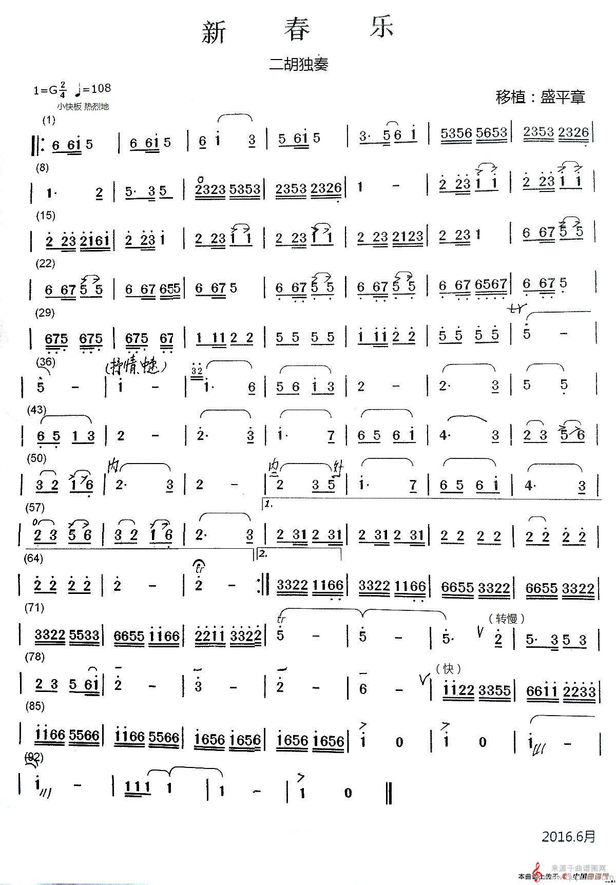 新春乐(盛平章移植版)曲谱(新春乐二胡独奏曲曲谱)