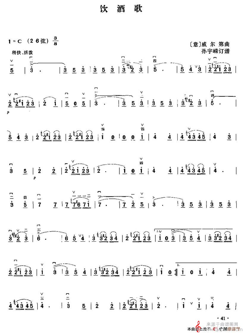 曲谱图网为您提供饮酒歌(选自歌剧《茶花女》)(孙宇嶸订谱版)简谱(饮酒歌二胡独奏简谱)找谱子,就上曲谱图网。