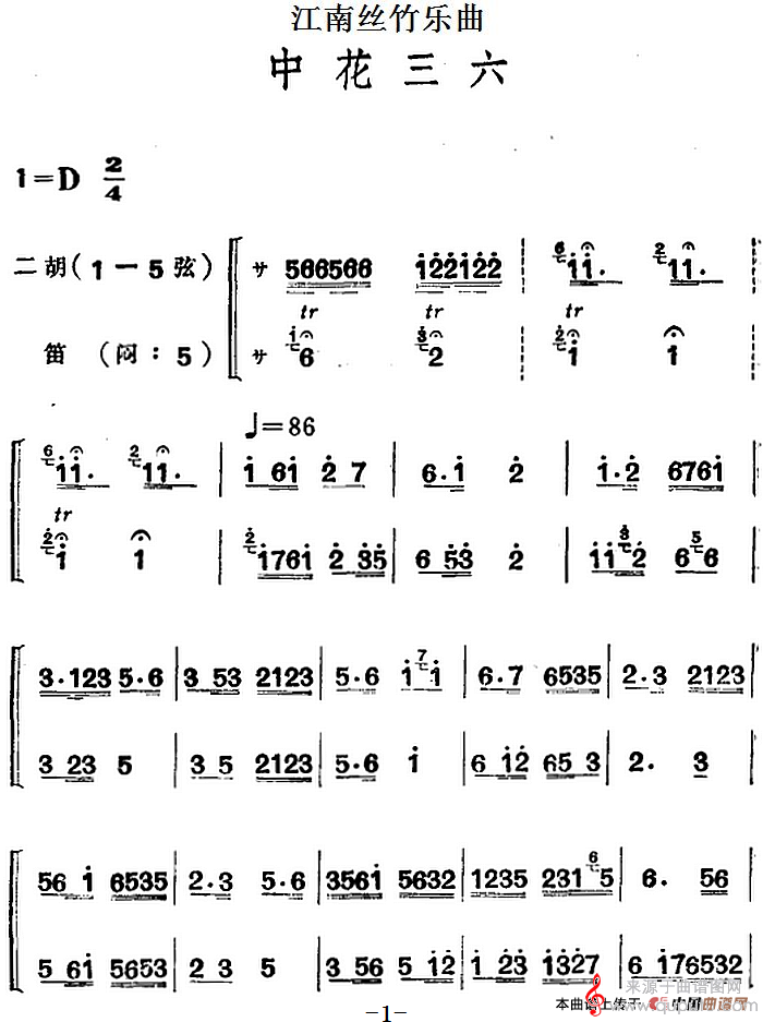 曲谱图网为您提供江南丝竹乐曲:中花三六简谱(江南丝竹乐曲:中花三六二胡+笛演奏简谱)找谱子,就上曲谱图网。