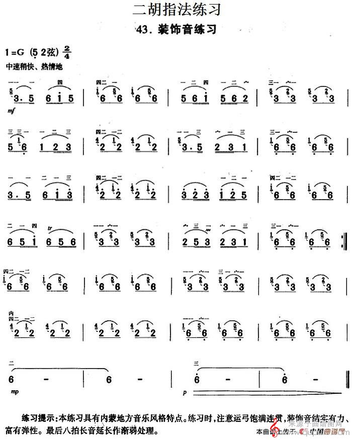 二胡指法练习:装饰音练习简谱(二胡指法练习:装饰音练习示范曲)