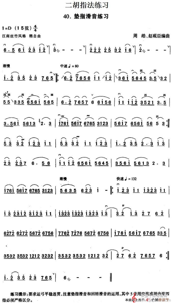 二胡指法练习:垫指滑音练习曲谱(二胡指法练习:垫指滑音练习示范曲)