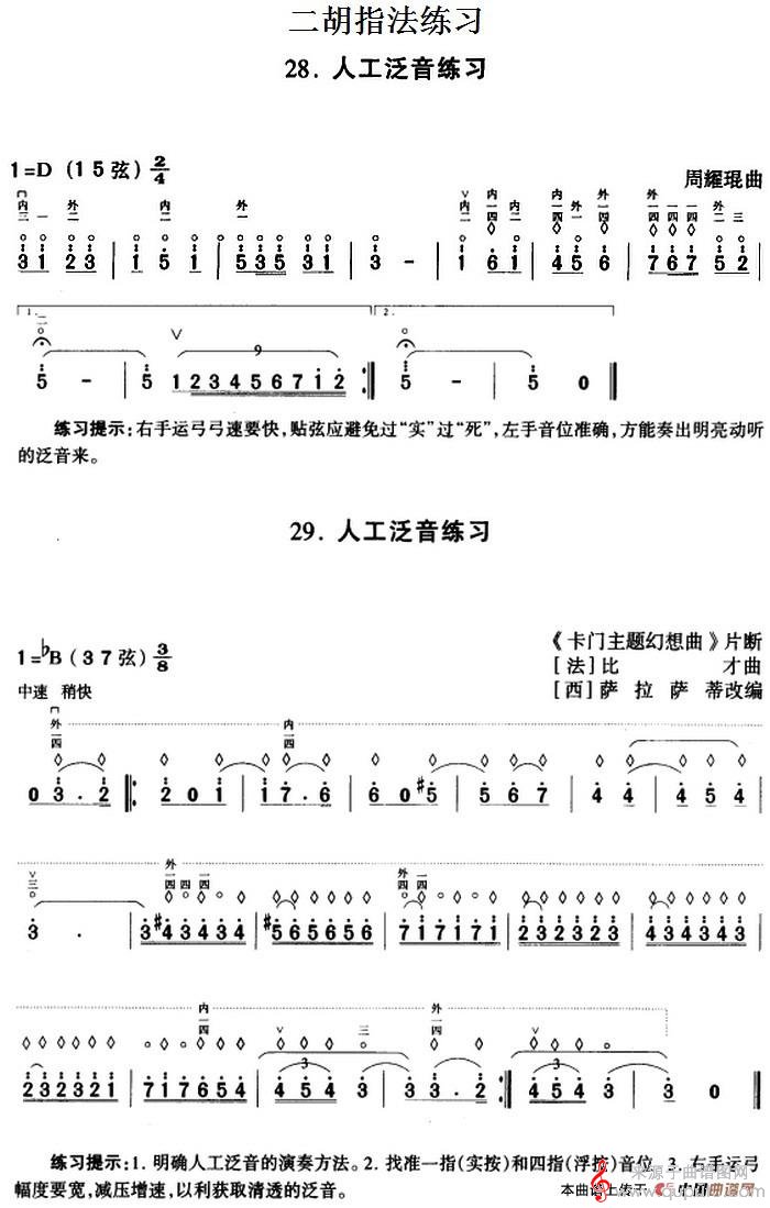 二胡指法练习:人工泛音练习简谱(二胡指法练习:人工泛音练习示范曲)