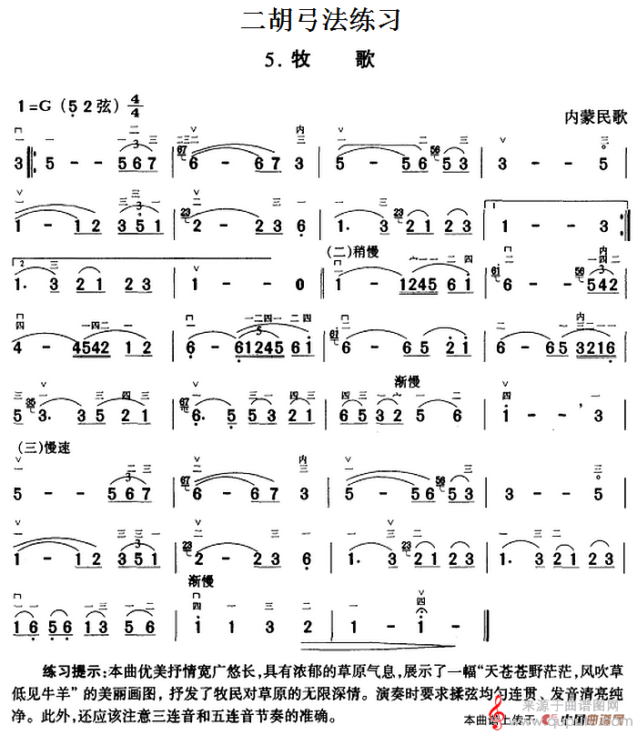 二胡弓法练习:牧歌简谱(二胡弓法练习:牧歌示范曲)
