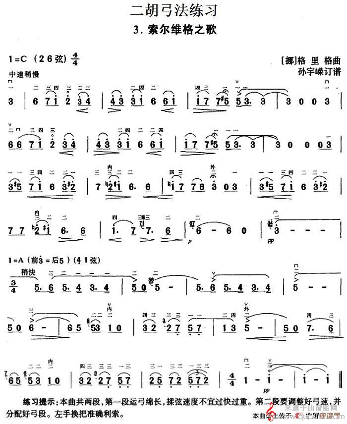 曲谱图网为您提供二胡弓法练习:索尔维格之歌简谱(二胡弓法练习:索尔维格之歌示范曲)找谱子,就上曲谱图网。