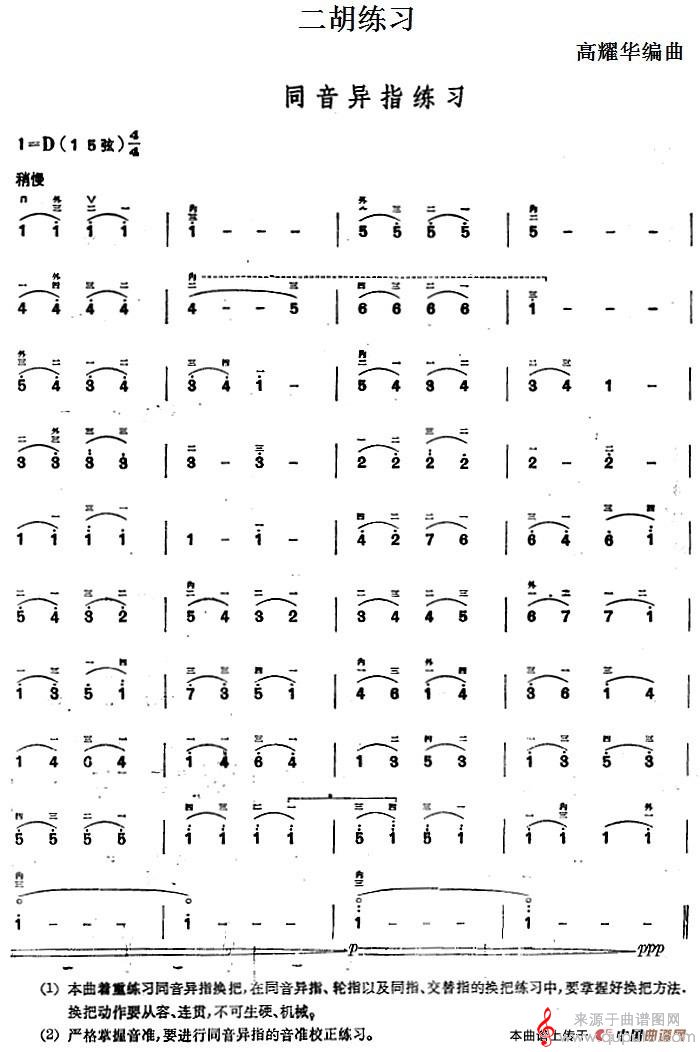 二胡练习:同音异指练习简谱(二胡练习:同音异指练习示范曲)