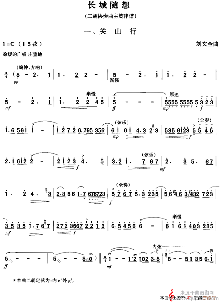 曲谱图网为您提供长城随想一、关山行简谱(长城随想一、关山行二胡协奏曲主旋律谱)找谱子,就上曲谱图网。