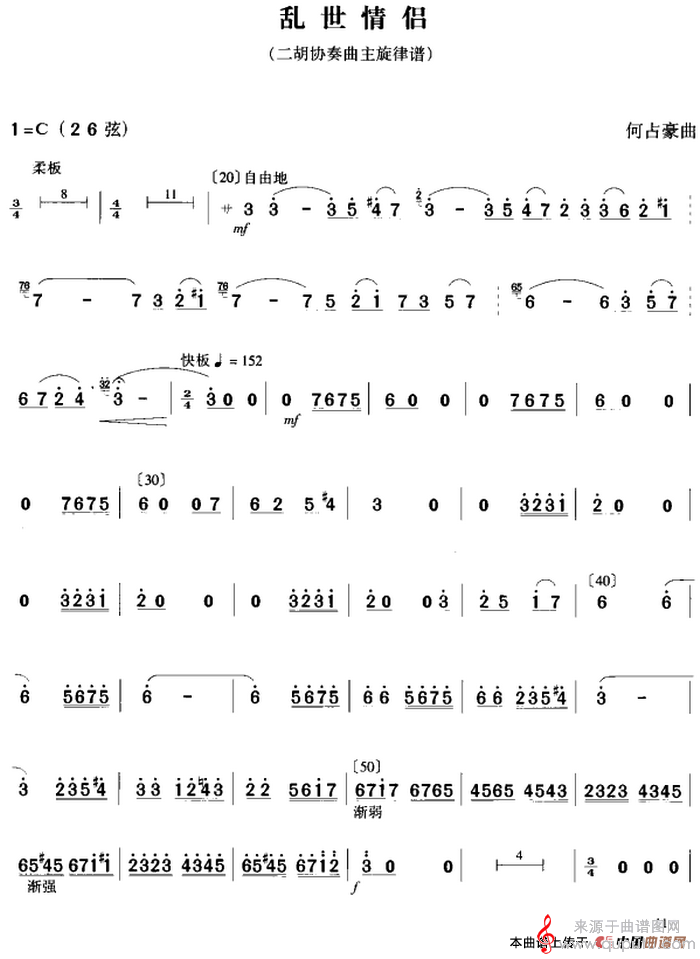 曲谱图网为您提供乱世情侣简谱(乱世情侣二胡协奏曲主旋律谱)找谱子,就上曲谱图网。
