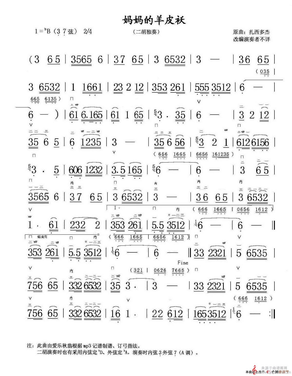 当前位置:曲谱图网器乐曲谱胡琴妈妈的羊皮袄简谱(妈妈的羊皮袄二胡独奏曲曲谱,根据同名歌曲改编)