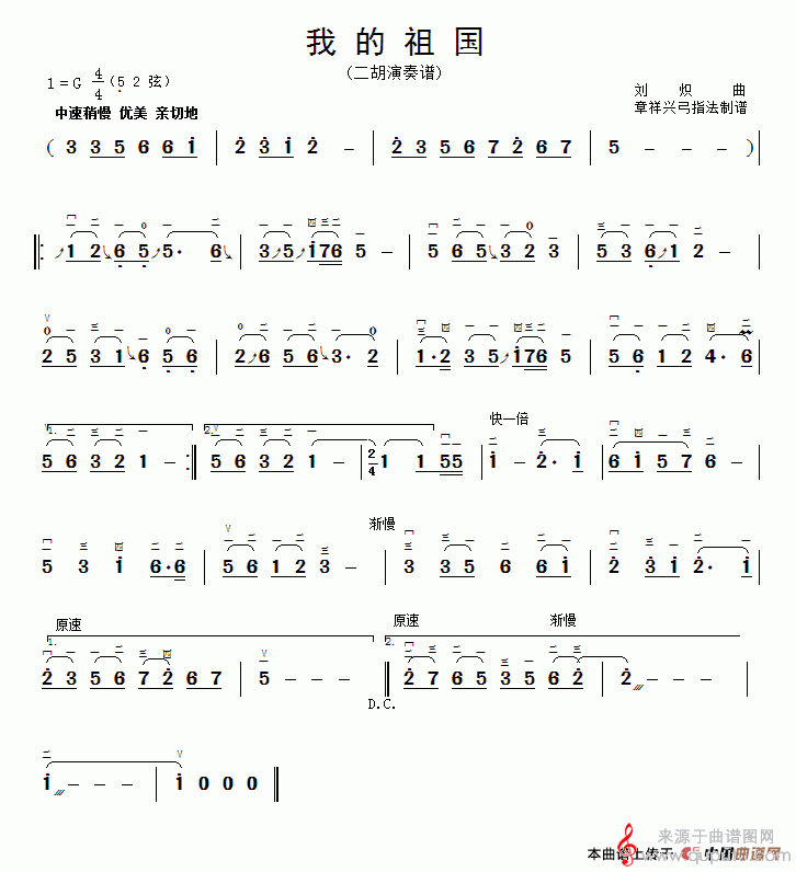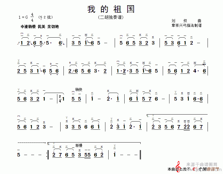 我的祖国曲谱(我的祖国章祥兴订弓指法 二胡独奏曲曲谱)