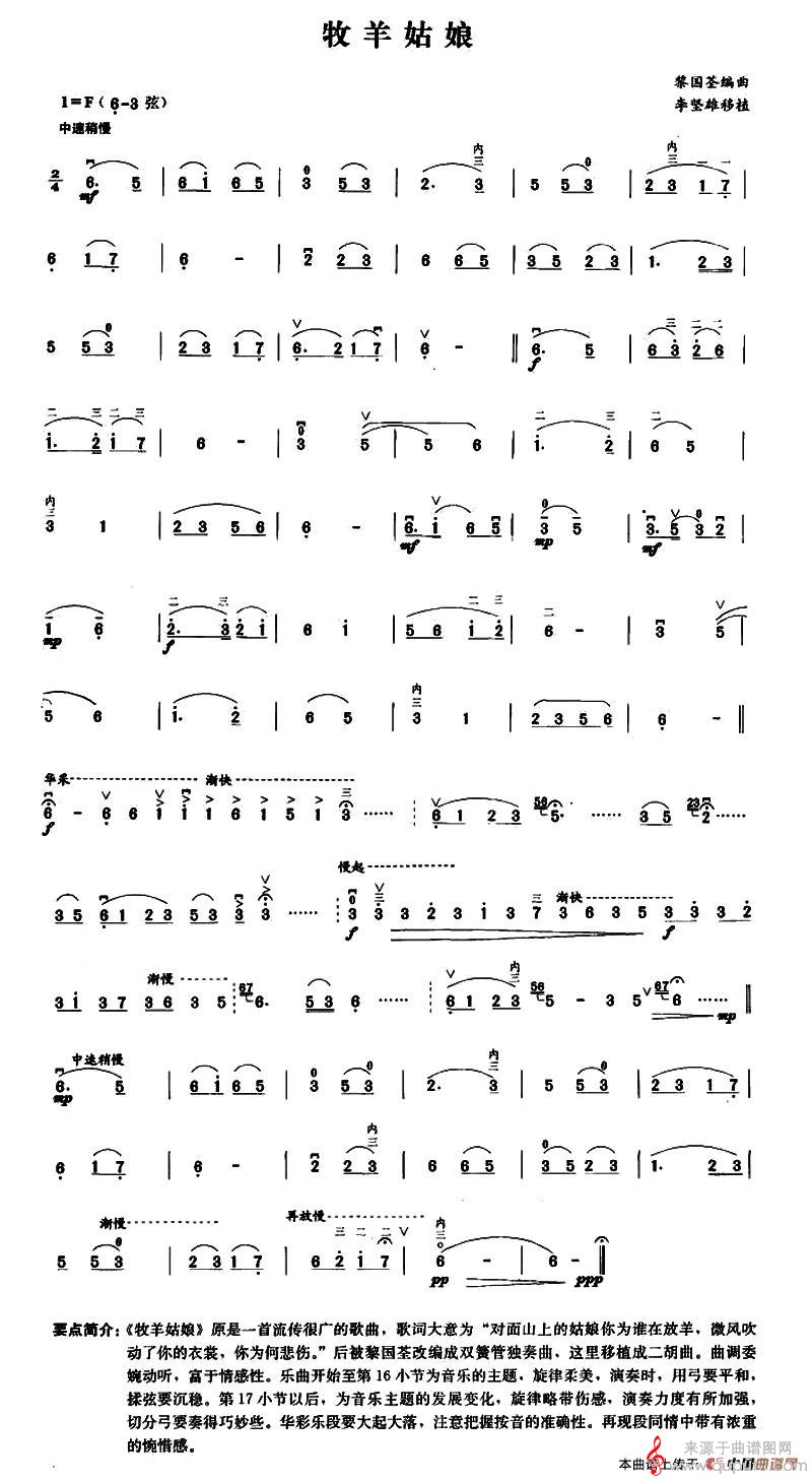 牧羊姑娘简谱(牧羊姑娘黎国荃编曲 李坚雄移植版 二胡独奏曲曲谱)