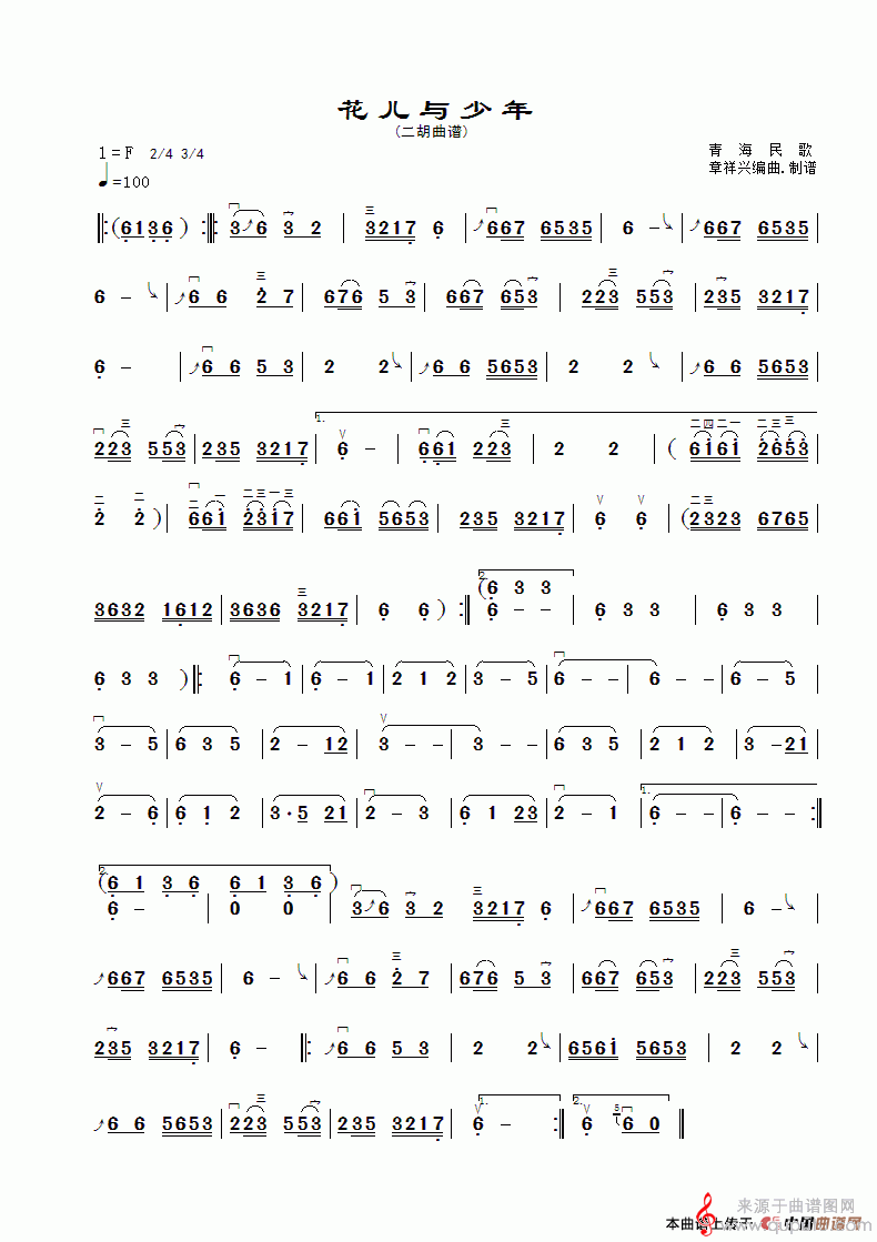 曲谱图网为您提供花儿与少年简谱(花儿与少年二胡独奏曲谱、章祥兴制谱版)找谱子,就上曲谱图网。