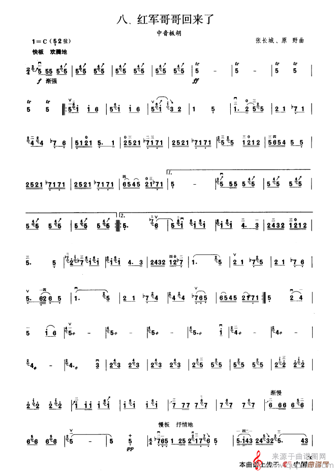 曲谱图网为您提供红军哥哥回来了简谱(红军哥哥回来了 板胡曲集第六级 中音板胡演奏曲谱)找谱子,就上曲谱图网。