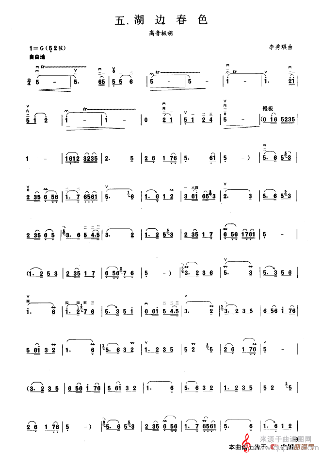 湖边春色简谱(湖边春色 板胡曲集第五级 高音板胡演奏曲谱)